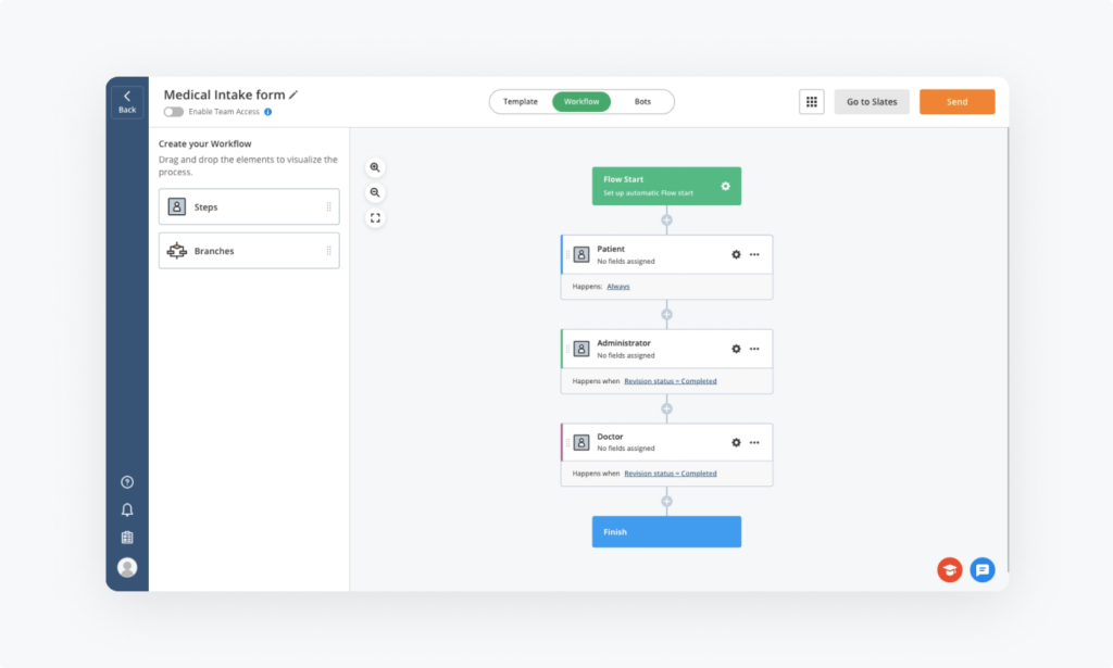 • The workflow Steps and access permissions you assign (you can add the Steps you need and assign documents to them; the most typical Steps for this flow template are Patient, Doctor, and Administrator):