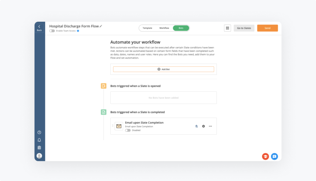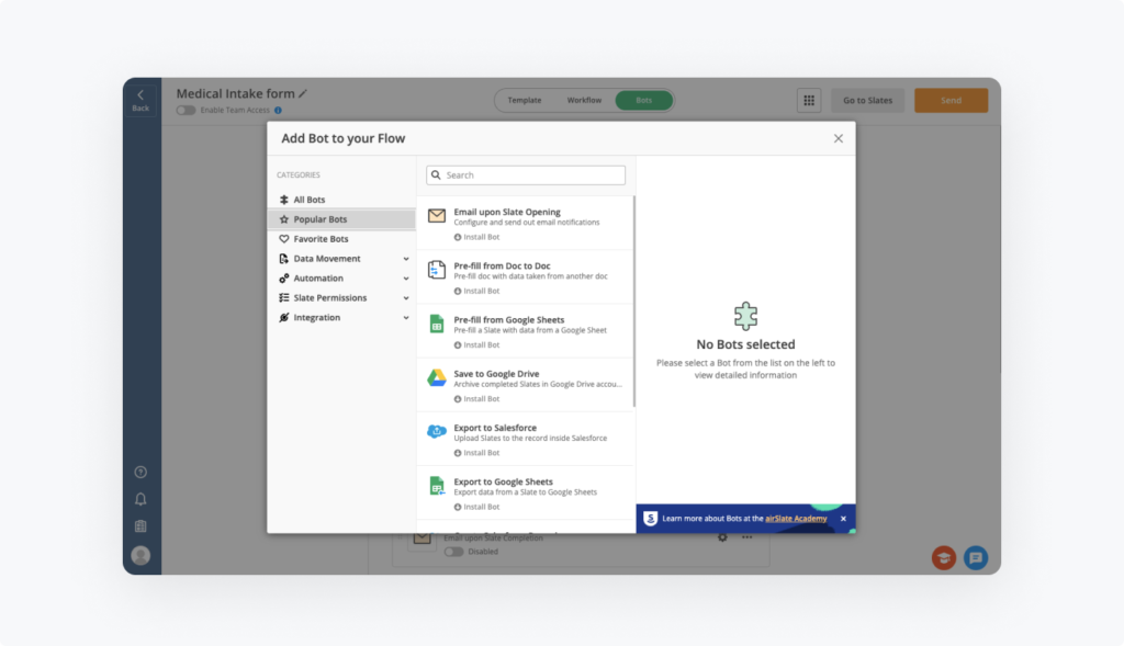 5. Install and configure airSlate Bots to automatically transfer data, send notifications, archive completed documents, and more. The Bots are no-code so their configuration doesn’t require any technical skills.