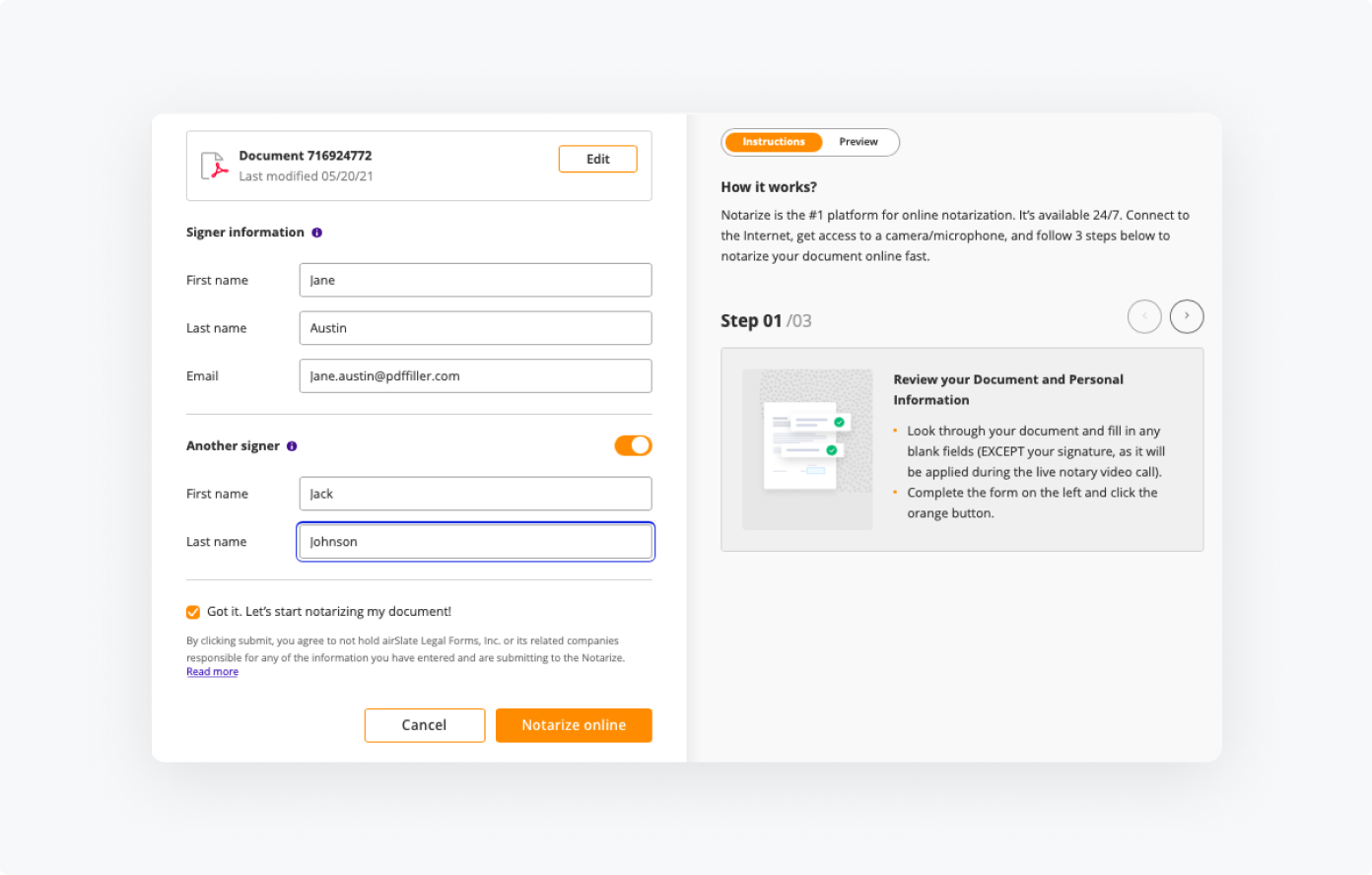 3. After that, you’ll be prompted to log in or create an account with US Legal Forms. Proceed to the online notarization process with Notarize. Use the Preview option on the right side of the screen to review your document and personal information. If changes are necessary, click the Edit button to fill in any blank fields except your signature, as it will be applied during the live call with the notary.