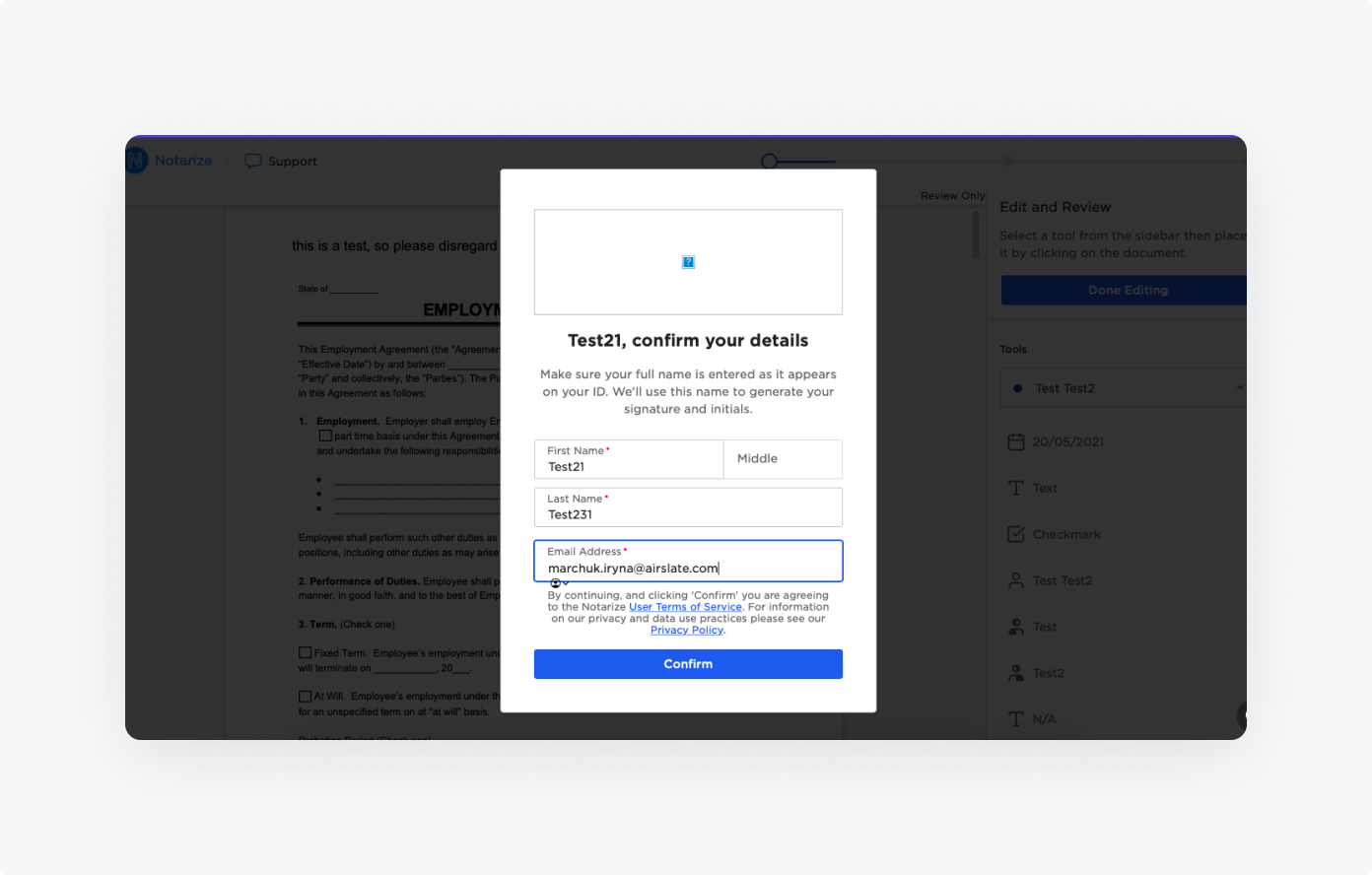 6. On the Notarize website, you’ll be asked to confirm your details. Make sure that your full name is entered as it appears on your ID because Notarize will use it to generate your signature and initials. If everything looks correct, click Confirm to proceed.