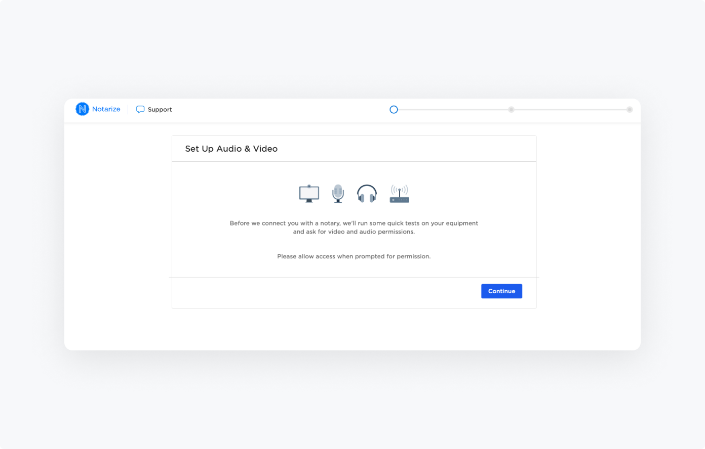 7. You’ll then be redirected to the Set Up Audio & Video screen to run some quick tests and ask for video and audio permissions before you get connected to the online notary. Click Continue to proceed.