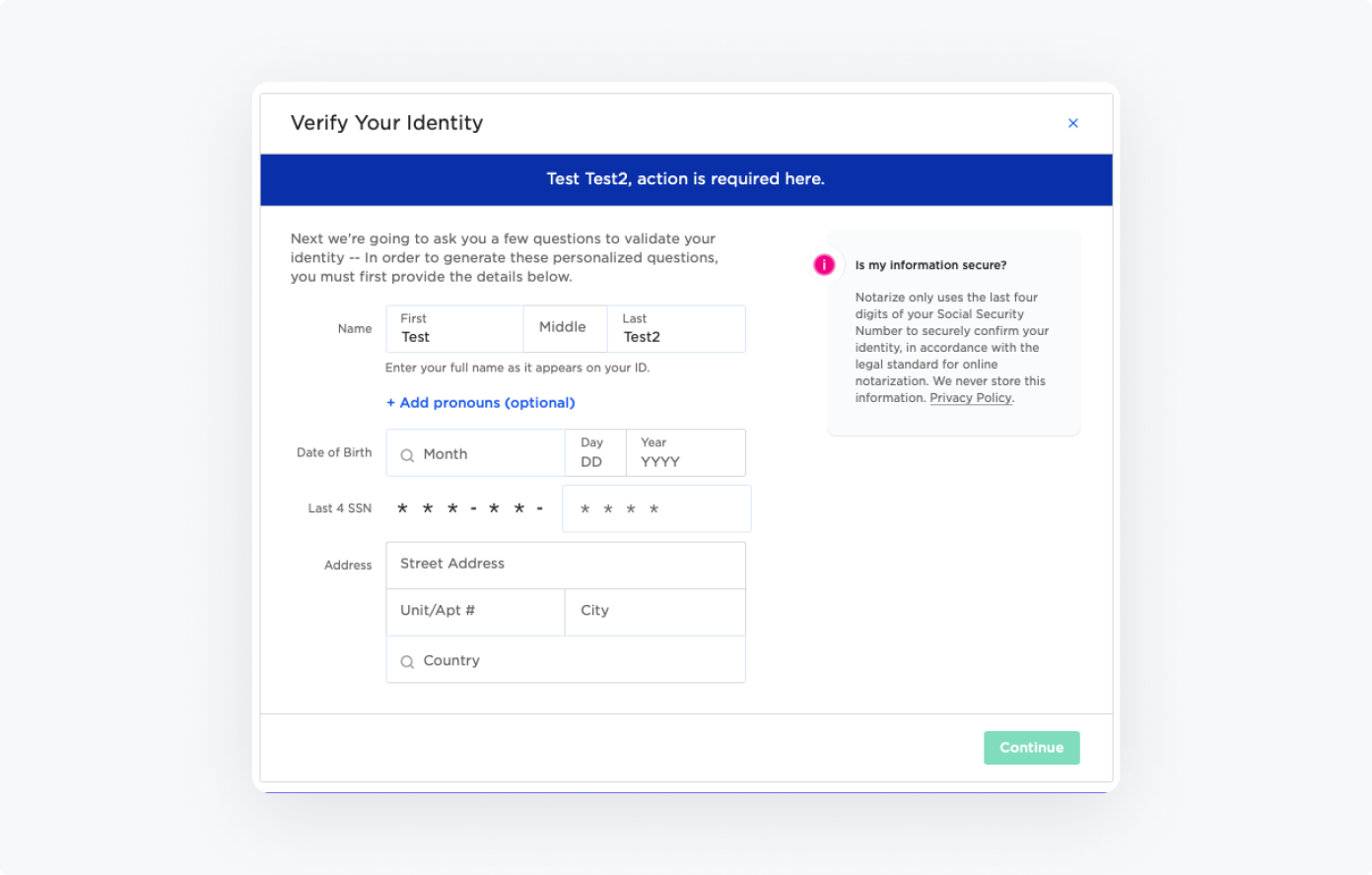 To generate your personal identification questions, fill in the details requested in the Verify Your Identity chart. When finished, click Continue → Get started.