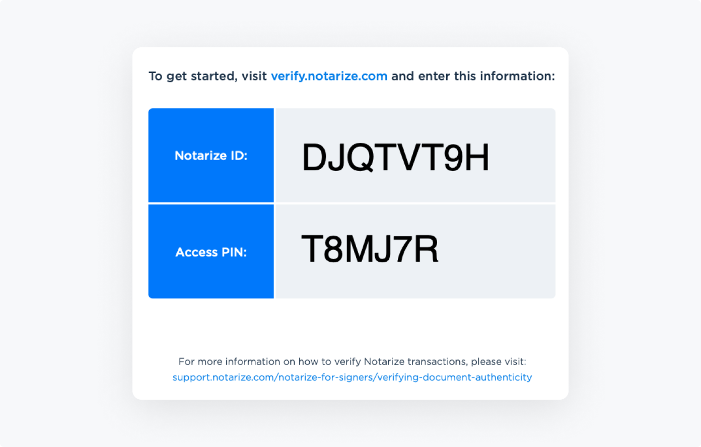 Every Notarize transaction is recorded and saved for a minimum of five years. Whether you receive an electronic or printed paper copy of a Notarize document, you can access details of the transaction and verify its authenticity using the Notarize ID and an access PIN.