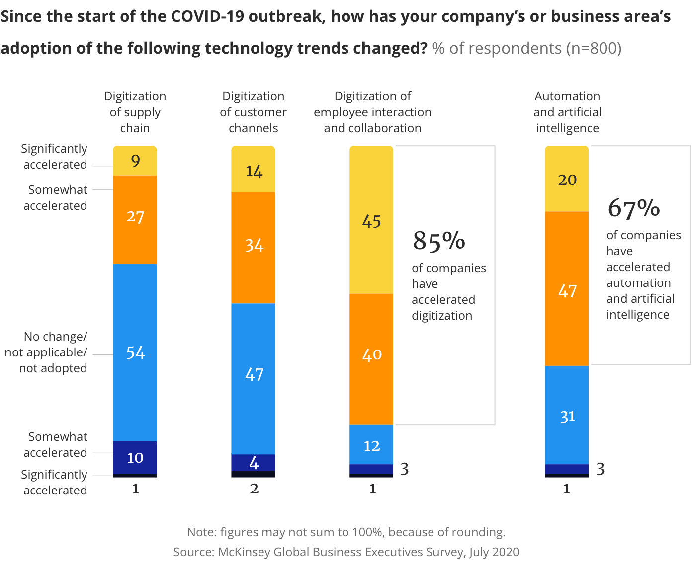 57% of organizations performed pilot tests for solutions to automate at least one business process pre-COVID. #nocode #automation @airSlateAcademy Share on XAccording to a 2020 global survey of business leaders by McKinsey, 85% of enterprises have somewhat or greatly accelerated the deployment of videoconferencing and filesharing technologies to facilitate remote employee interactions. In addition, 50% of enterprises increased the digitization of customer channels (via mobile apps and chatbots), while some 35% have further digitized their supply channels.